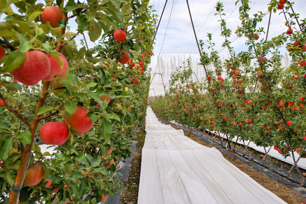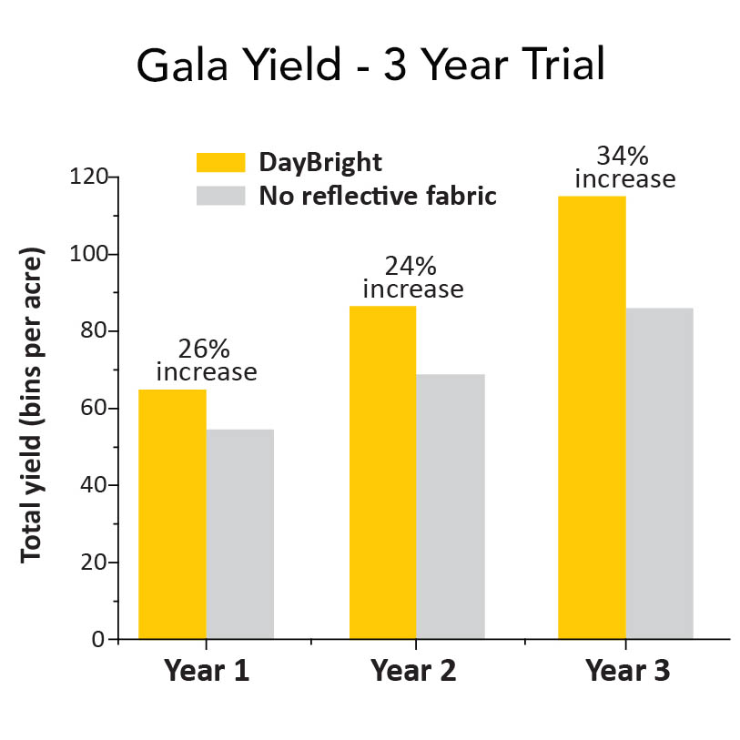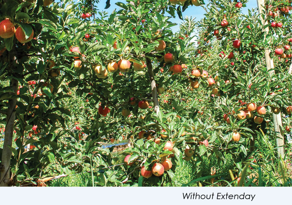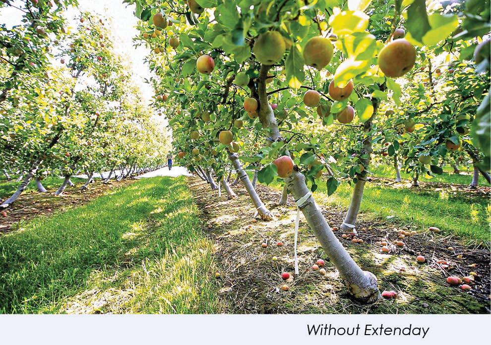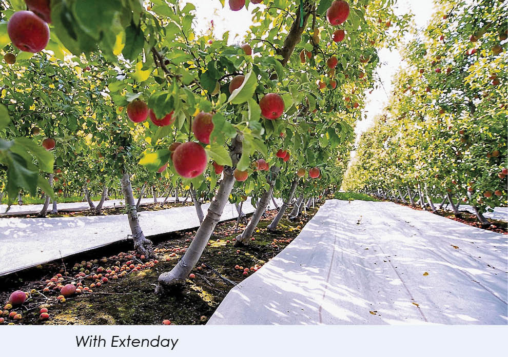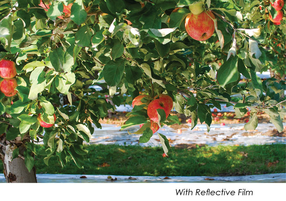 Extenday Reflective Fabric reflects sunlight into the lower branches of the apple trees. Increased light promotes photosynthesis, which promotes better fruit development and ripening. Using from flowering to harvest will increase yields.