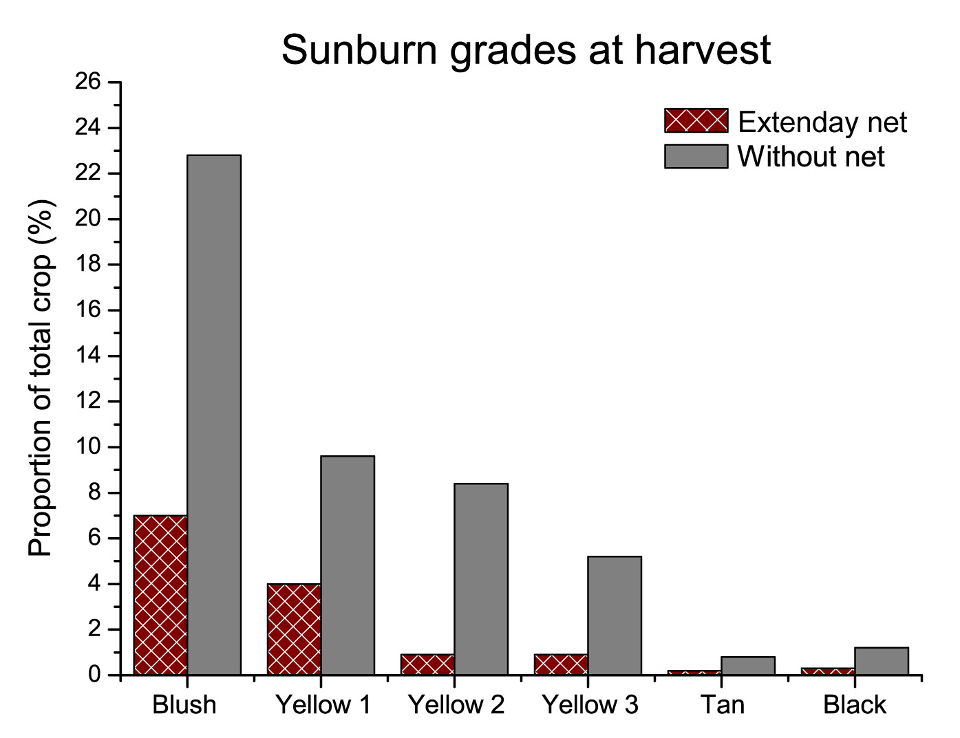 With Extenday’s reflective technology, our nets protect apples from sunburn. Extensive trials have proven that our nets are a reliable solution for reducing sunburn and maximizing yields.